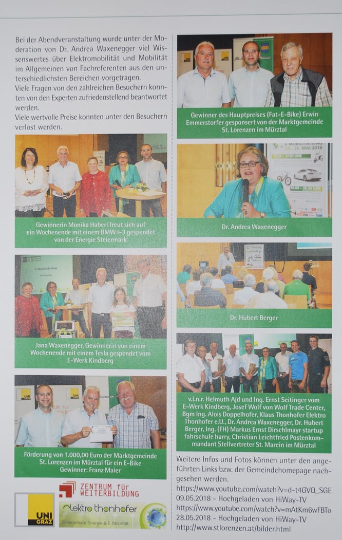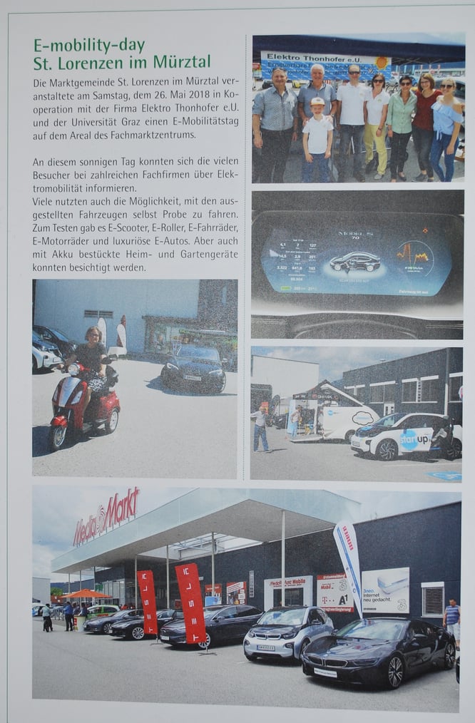 Am 26. Mai.2018 findet beim Fachmarktzentrum St. Lorenzen ein E-Mobilitätstag für Jung und Alt statt.Die Marktgemeinde St. Lorenzen stellt in Kooperation mit der Firma Elektro Thonhofer und der Universität Graz einen e-Mobilitätstag auf die Beine "wie es ihn wohl noch nicht gegeben hat", sind sich die Veranstalter bei der ankündigenden Pressekonferenz einig.