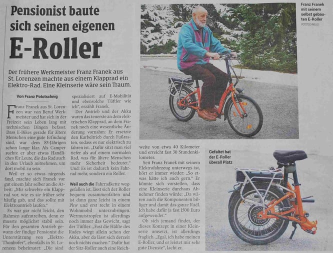 01/2018 Kleine Zeitung: Unser E-Antrieb Smart Pie 5 und ein 36V/10Ah Akku liefern den nötigen Vortrieb!